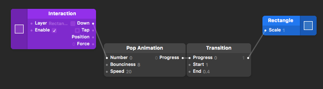 3. 按command+return呼出搜索控件库的对话框,输入 Interaction 按return,窗口即出现 Interaction 控件。同理再添加 Popanimation 和 Transition 控件。此时应当如图,如果连线不正确可以按照图上所示将对应参数连接。