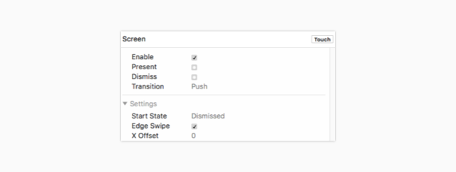 Screen 是 Layer,需要点击“+”添加。(在列表的较后位置可以找到)Screen 层可以理解为一个带转场动画的 Group 层,可收纳其他的层。输入Present/Dismiss 两个值能显示或隐藏层,默认的转场动画是 Push 从右侧滑入,也可以改成 None 不需要动画或 Modal 从底部滑入。