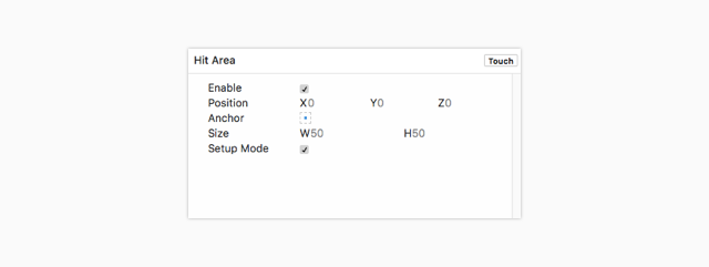 Hit area 与其它层一样,可以添加各种交互动作。添加后在预览窗会出现一个半透明的红色矩形,可以修改 PositionX/Y/Z 与 SizeH/W 等。它的优势在于可以一键切换 Setup Mode ,显示或隐藏层。(点击右上角 Touch 按钮可添加 Interaction 组件)