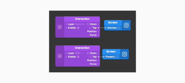 5. 给两个 Hit Area 添加 Interaction 组件。分别连接至Screen 层的 Present 与 Dismiss。如图